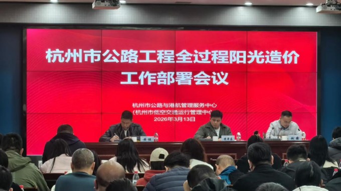 为构建公路工程全过程阳光造价体系,鼓励从业单位应用标准化编码编制各阶段造价文件,指导建设单位应用数字化平台报送造价文件,贯通各阶段造价数据,提升浙江省公路工程建设项目造价标准化、数字化管理水平,有效控制公路工程建设项目投资,深化工程造价管理改革,推动公路工程建设领域标准化、数字化、阳光化发展,浙江省交通运输厅发布了《浙江省公路工程全过程阳光造价管理工作指引》(以下简称“指引”)。杭州市公路与港航管理服务中心(杭州市低空交通运行管理中心)2026年3月13日举办了杭州市公路工程全过程阳光造价工作部署会议,旨在进一步推动阳光造价在实施阶段的应用构建“阳光造价”管理体系,打造平安百年品质工程。会议聚集了业主、设计、施工、监理、审计等相关负责人,共同就阳光造价的核心理念、实践应用进行了深入学习和讨论。