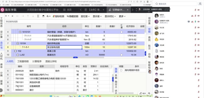 此次培训采用线上教学,第一天以实际操作结合“施工图预算、工程量清单”为小例题,理论实践相辅相成提高学习效率。以某高速公路段图纸为实例,让学生在课堂内接触到实际项目,以2018版《公路工程建设项目概算预算编制办法》及甘肃省补充规定、《公路工程建设项目造价文件管理导则》、《公路工程预算定额》、《工程量清单计量规则-公路工程施工招标文件》为依据,结合纵横大司空云平台进行讲解和实操,将理论与实践融合为一体,更好的提高学习效率。